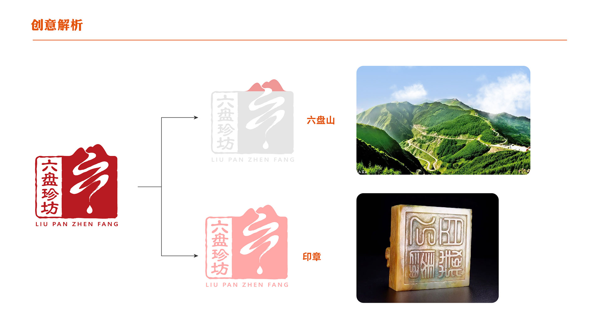 ①標志整體元素組合層級太多,視覺散亂。②標志字體常規化、記憶度不高,且字體筆畫過粗,標志縮小情況下“盤”“珍”兩字觀感不佳且不便于印刷。③標志頂部山體部分太過硬朗,和標志底部柔和線條風格差異過大,統一性不強,且硬朗的山形親和度不高。標志頂部山體太過常規化,且和六盤山山形特征差異過大,難以形成地域聯想。④標志底部線條重心靠右,導致標志整體重心不穩,且收尾部分過于尖銳,親和度不夠。⑤標志整體缺乏行業屬性,行業關聯度不高。⑥標志色彩單一,視覺張力不足。