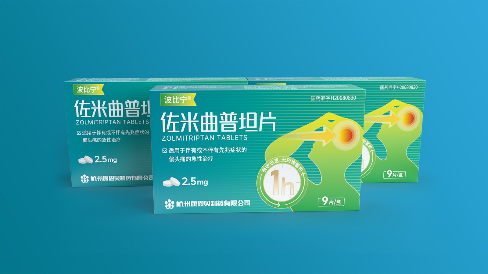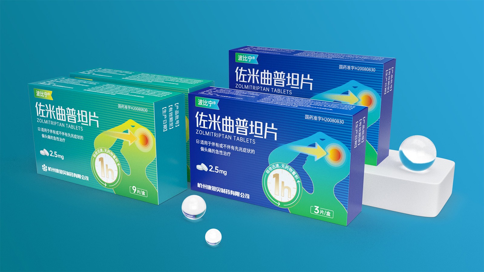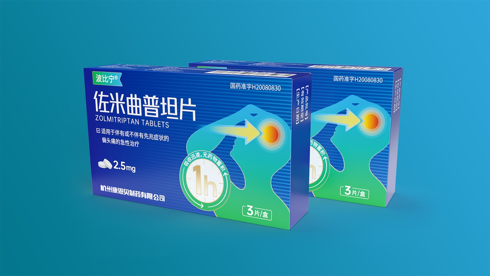 石特綜合考慮產品的使用場景、產品功效、消費者心理等因素并結合創意對藥品的包裝設計提出方案。對于佐米曲普坦片的包裝,以藍色為主色,藍色寓意健康,添加人體頭部剪影并展示頭痛癥狀,可以凸顯藥品的功效,被放大的1h也可以告訴人們該藥品的見效快速。