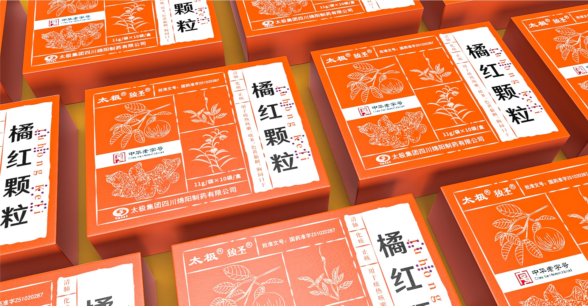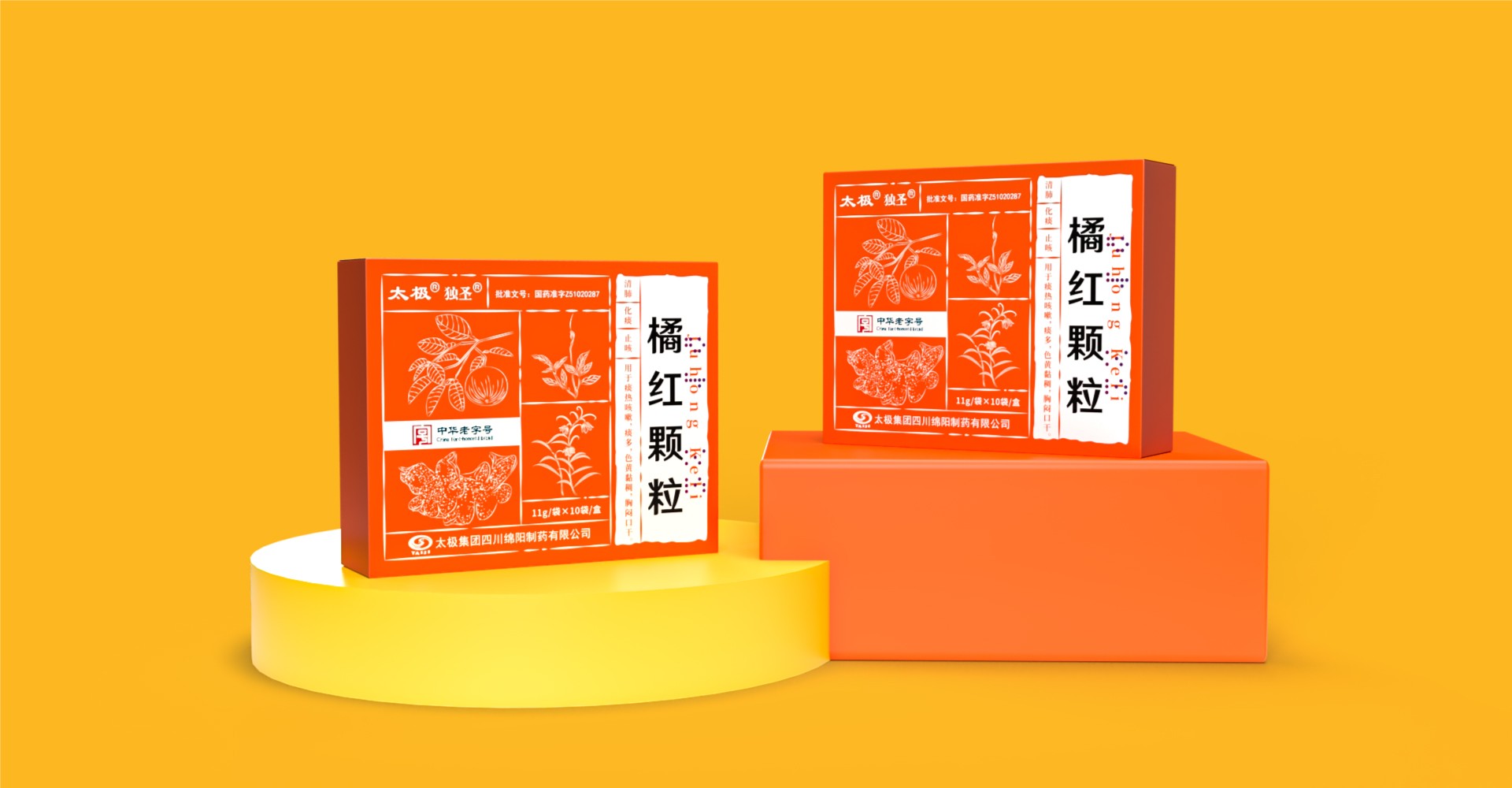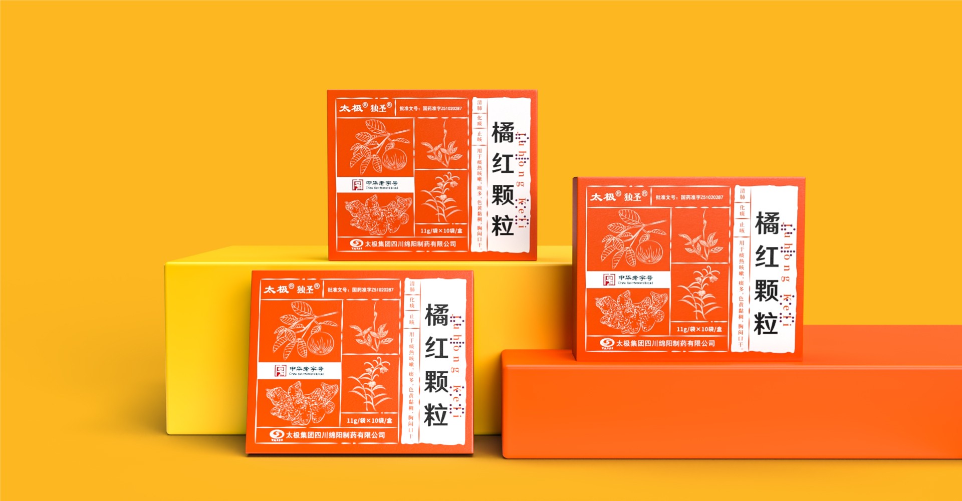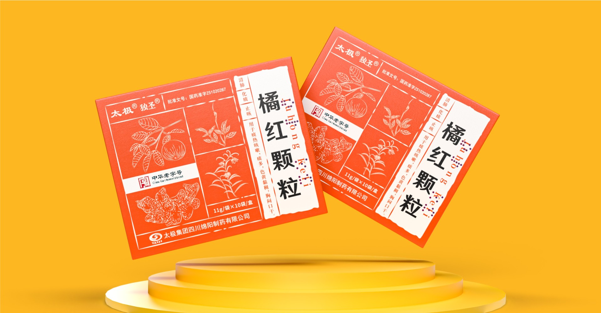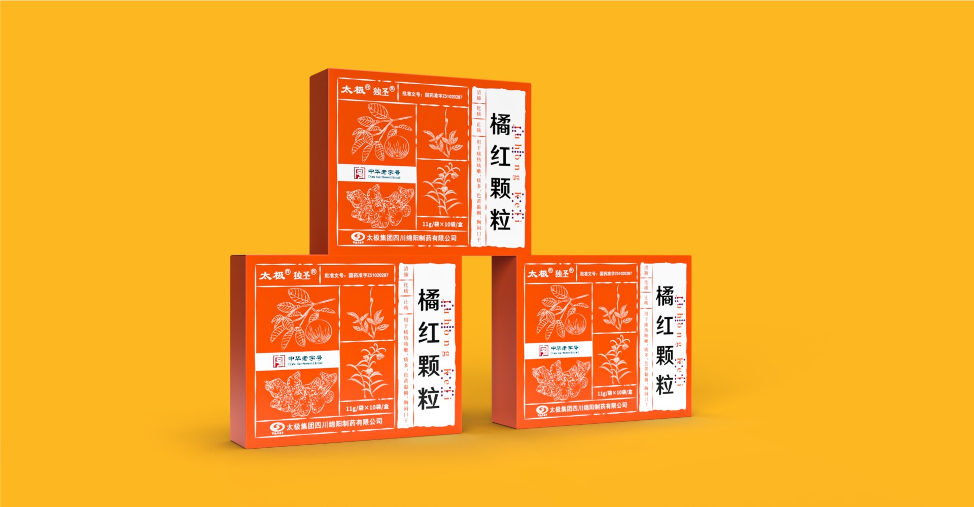 橘紅顆粒”作為中華老字號的中成藥,其包裝設(shè)計充分融合了傳統(tǒng)與現(xiàn)代元素,既展現(xiàn)了藥品的深厚文化底蘊,又體現(xiàn)了現(xiàn)代審美觀念。在色彩選擇上,包裝采用了鮮明的橙色背景,象征著活力與健康,同時也與中藥的溫暖屬性相契合。白色圖案和文字在橙色背景的映襯下更加醒目,使得包裝信息一目了然。