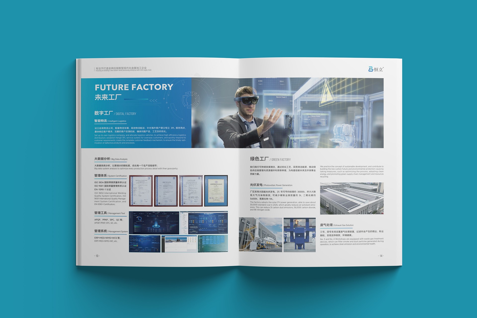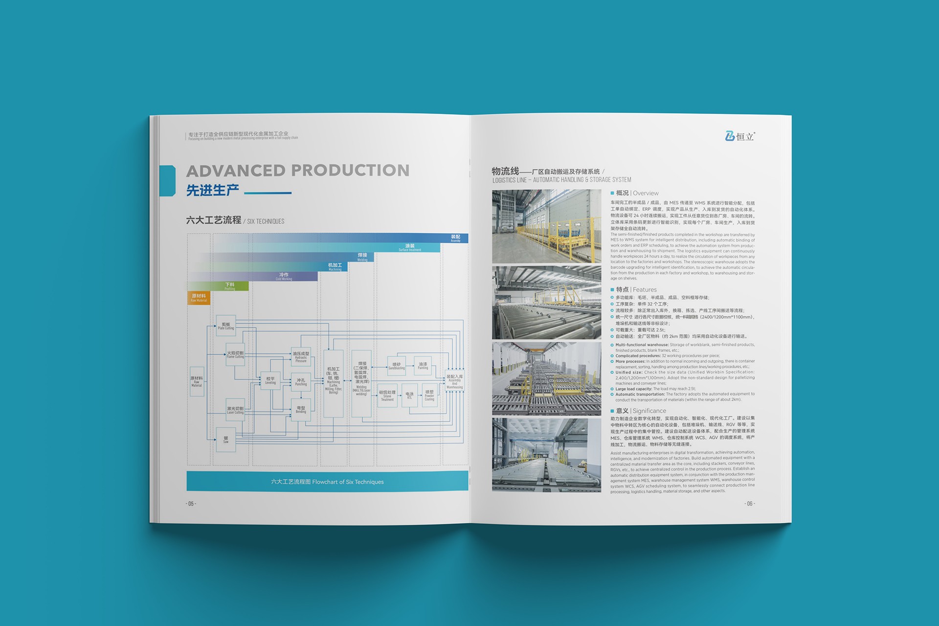 內(nèi)頁布局:通過模塊化設(shè)計清晰展示恒立的核心業(yè)務(wù),包括原材料供應(yīng)鏈、精密加工技術(shù)、表面處理工藝及物流配送體系,圖文并茂,一目了然。