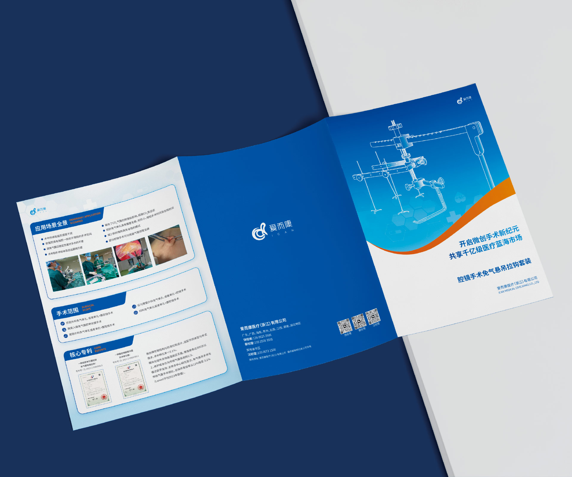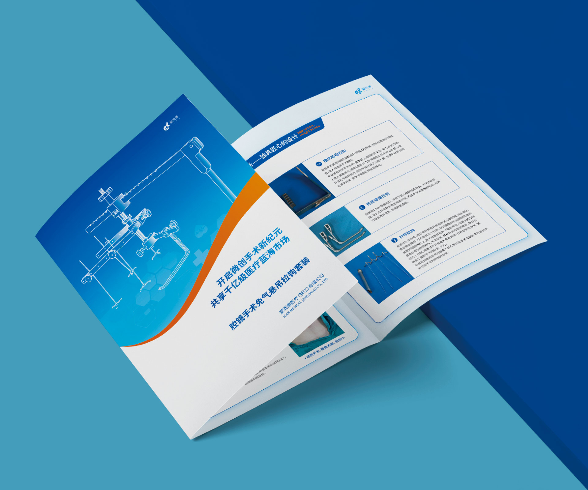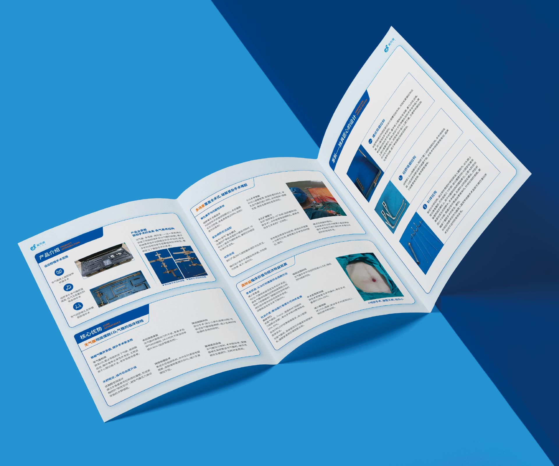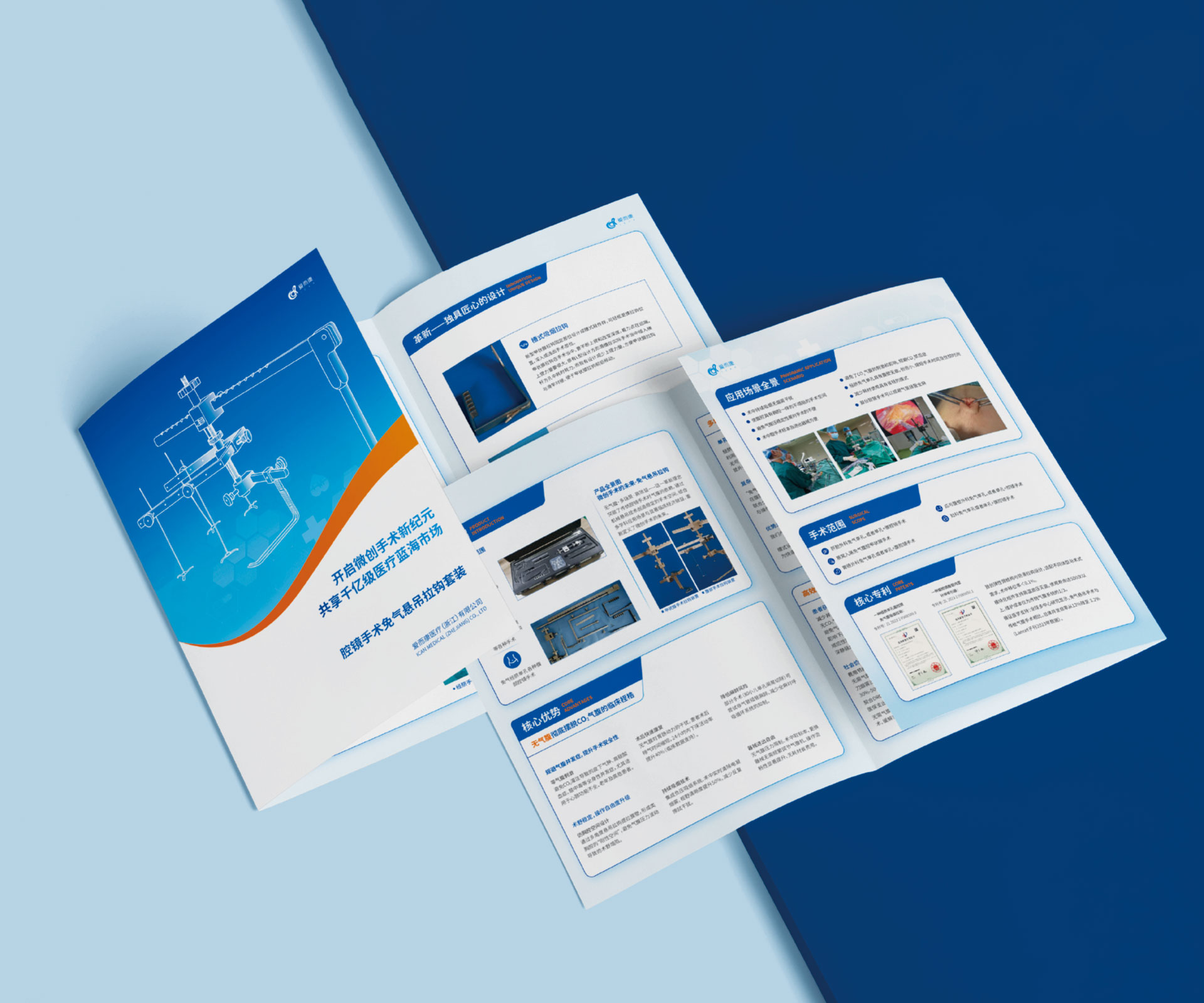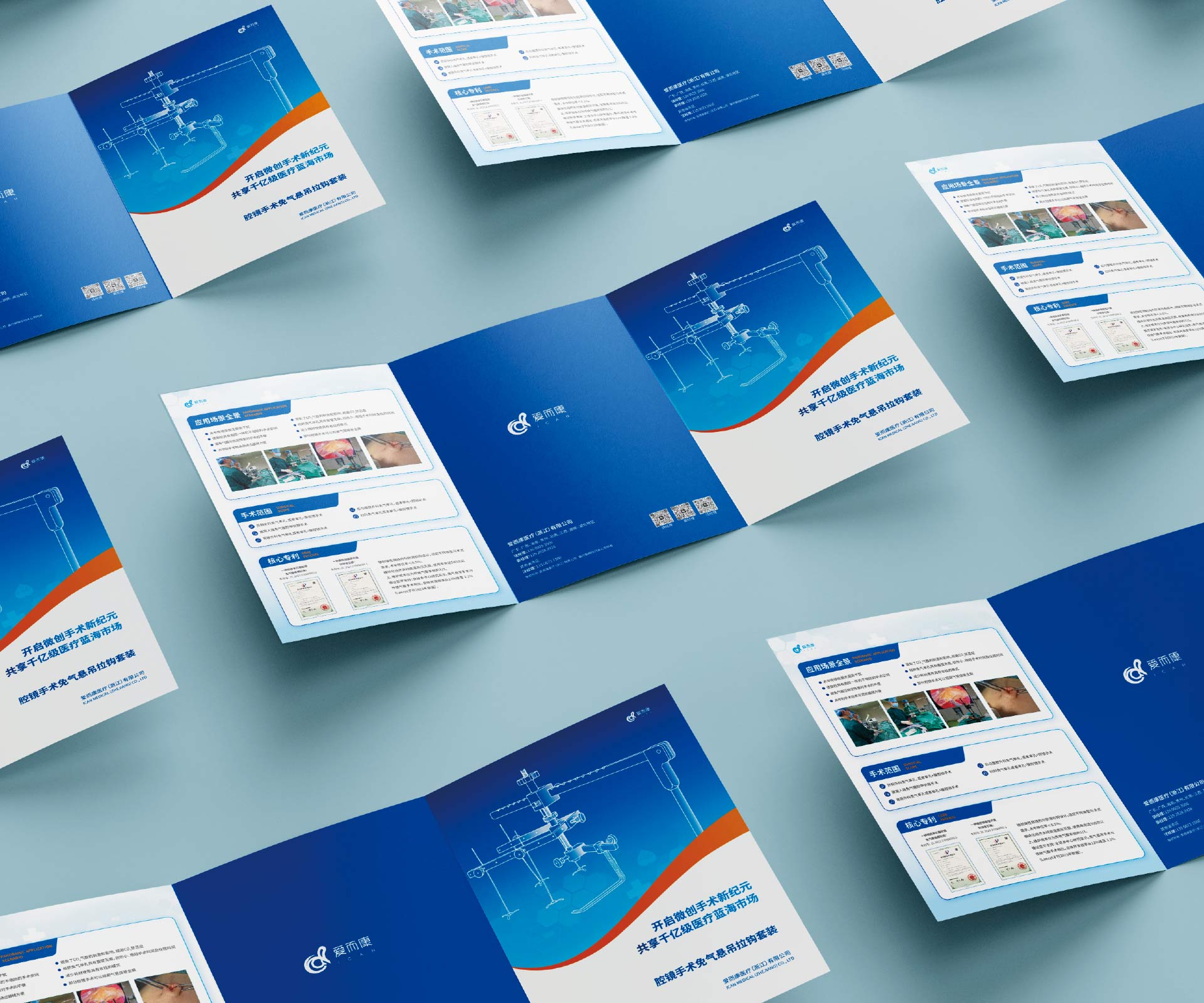 本項(xiàng)目是石特大健康為愛而康醫(yī)療(浙江)有限公司的創(chuàng)新產(chǎn)品——腔鏡手術(shù)免氣懸吊拉鉤套裝策劃設(shè)計(jì)的三折頁宣傳物料。該產(chǎn)品通過顛覆性的“免氣腹”懸吊技術(shù),為腔鏡手術(shù)提供了全新的解決方案。我們的核心挑戰(zhàn)在于,如何在這一份小巧的三折頁中,向時(shí)間寶貴的外科醫(yī)生清晰、直觀地闡釋這一相對陌生的技術(shù)原理,并將其與傳統(tǒng)氣腹手術(shù)的對比優(yōu)勢(如避免相關(guān)并發(fā)癥、提升手術(shù)安全性等)進(jìn)行強(qiáng)有力的傳達(dá),從而引發(fā)他們的興趣與嘗試意愿。