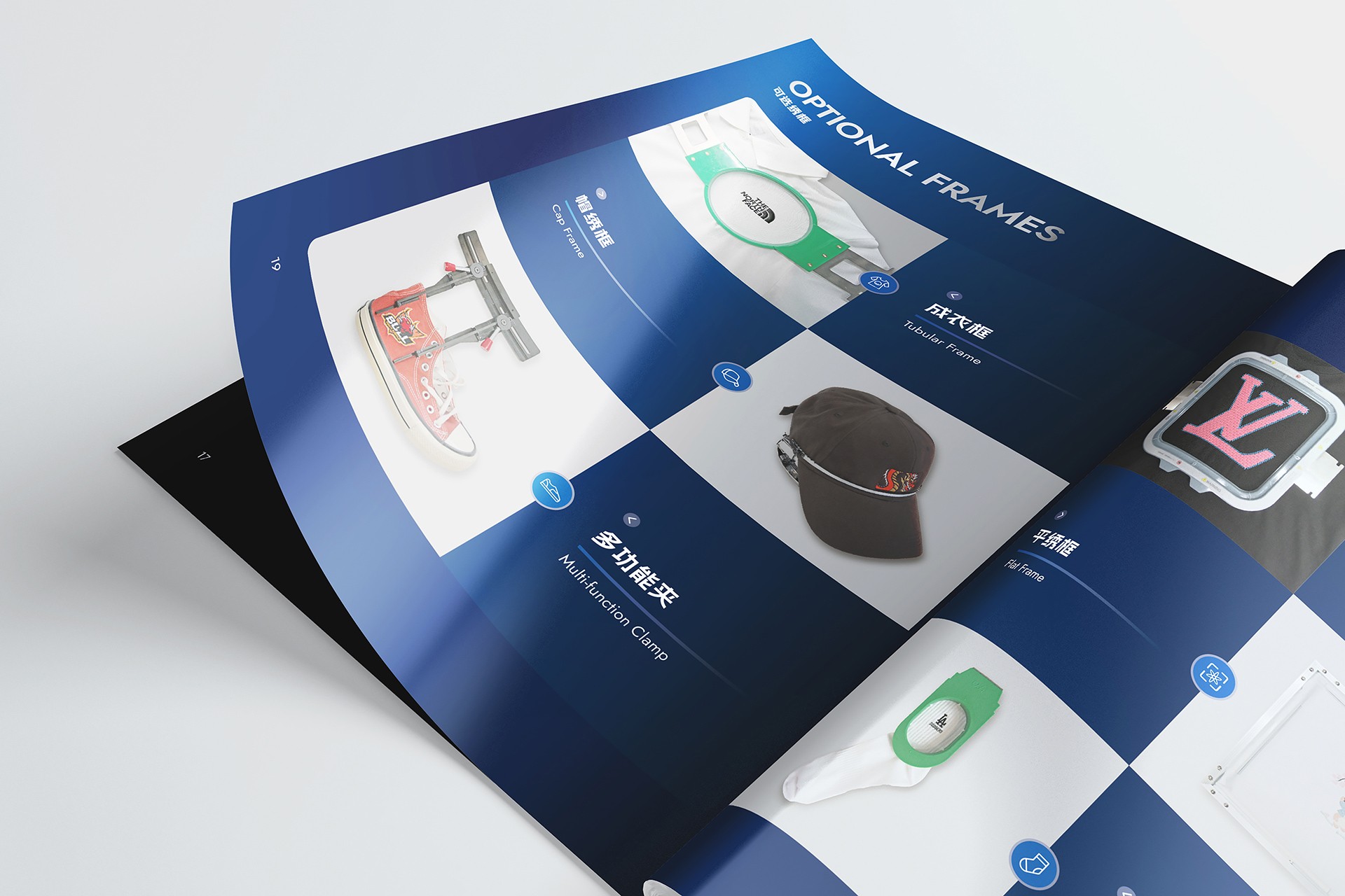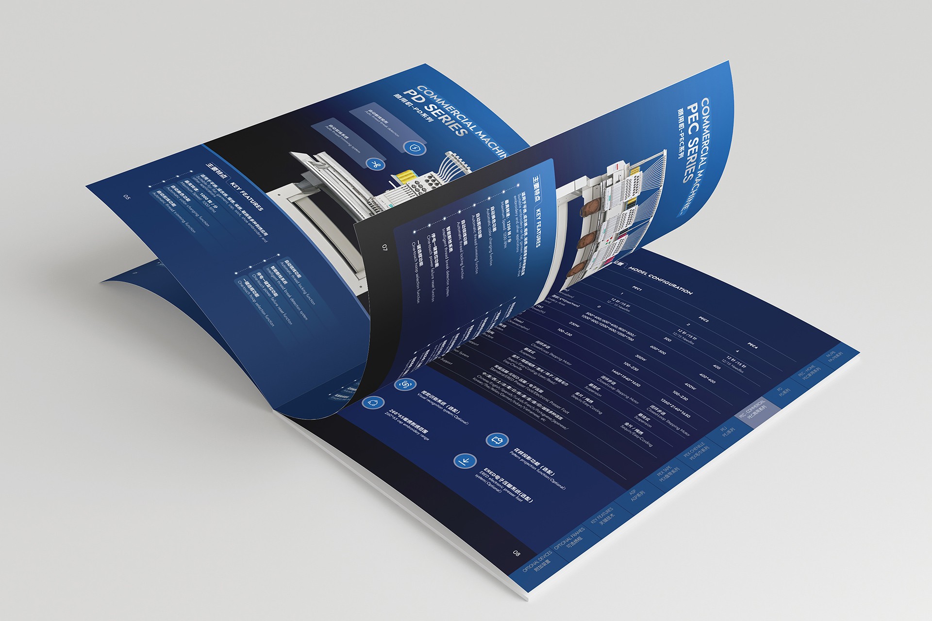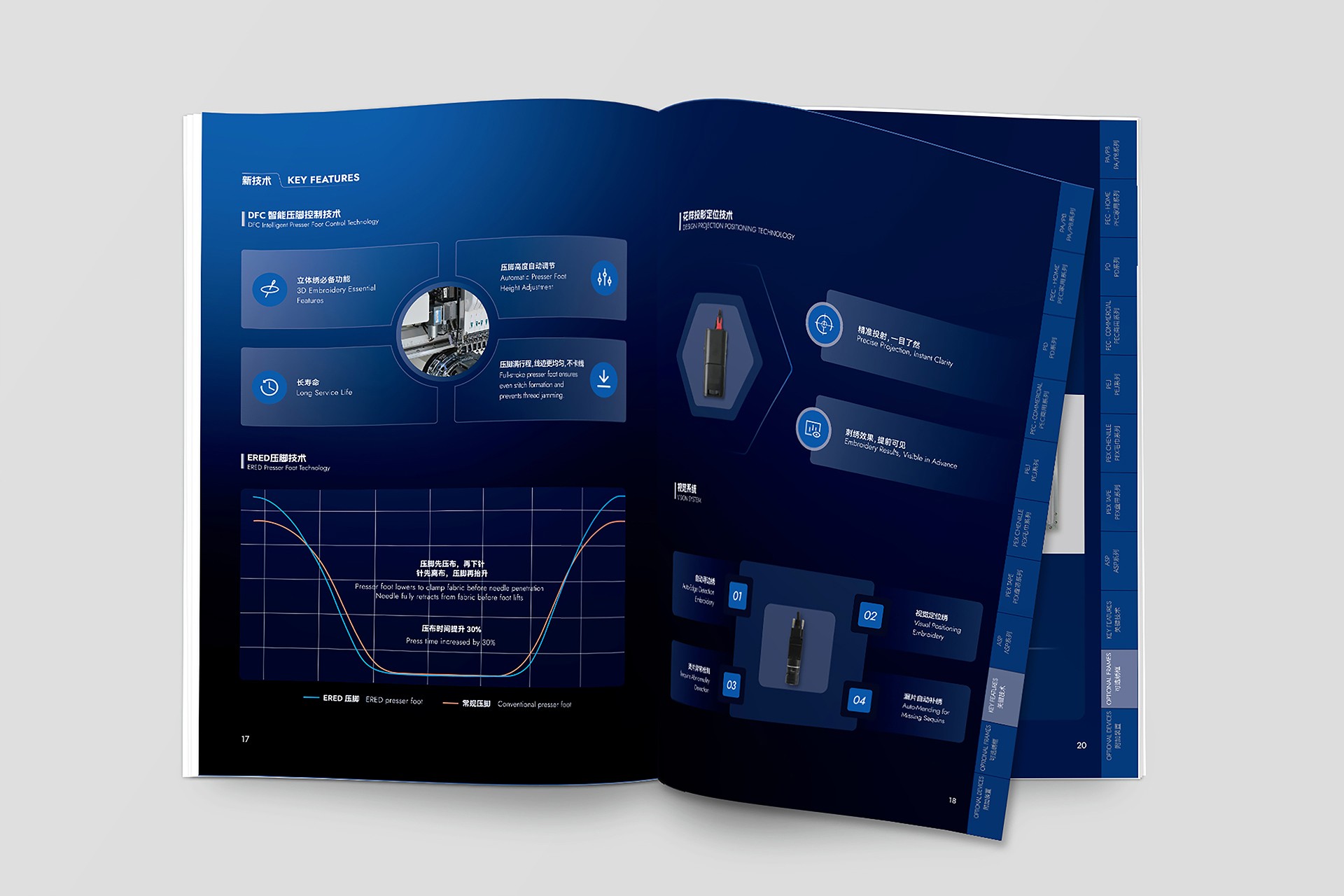 深色系工業(yè)美學(xué)視覺體系構(gòu)建: 開創(chuàng)性地采用深色背景(如深灰、墨藍(lán))作為畫冊(cè)主基調(diào)。這一選擇不僅凸顯了機(jī)械設(shè)備本身的金屬質(zhì)感與精密結(jié)構(gòu),更營造出專業(yè)、沉穩(wěn)、高端的視覺氛圍,在眾多競(jìng)品畫冊(cè)中脫穎而出,極具記憶點(diǎn)。