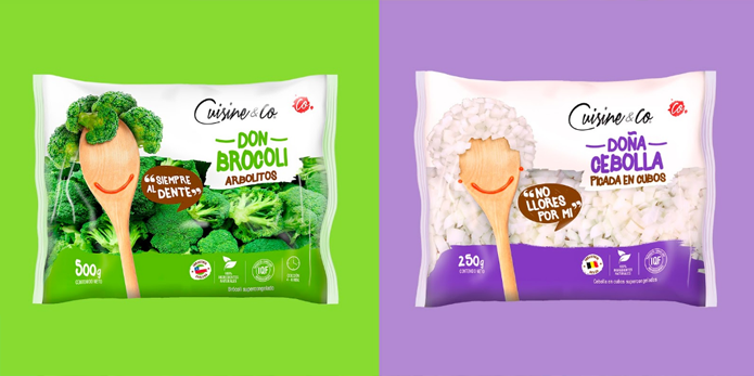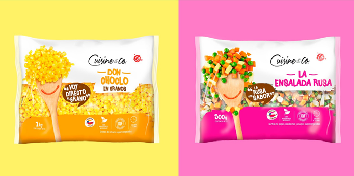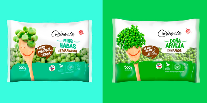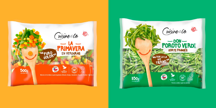 這款冷凍蔬菜的包裝設(shè)計(jì)中使用了智利廚房中非常典型的木勺,將簡(jiǎn)單并極具生活化的木勺與蔬菜進(jìn)行巧妙的結(jié)合,以創(chuàng)造有趣的角色來(lái)塑造每種蔬菜,使每種蔬菜都有了一個(gè)可愛(ài)的形象,并賦予蔬菜們不同的個(gè)性。