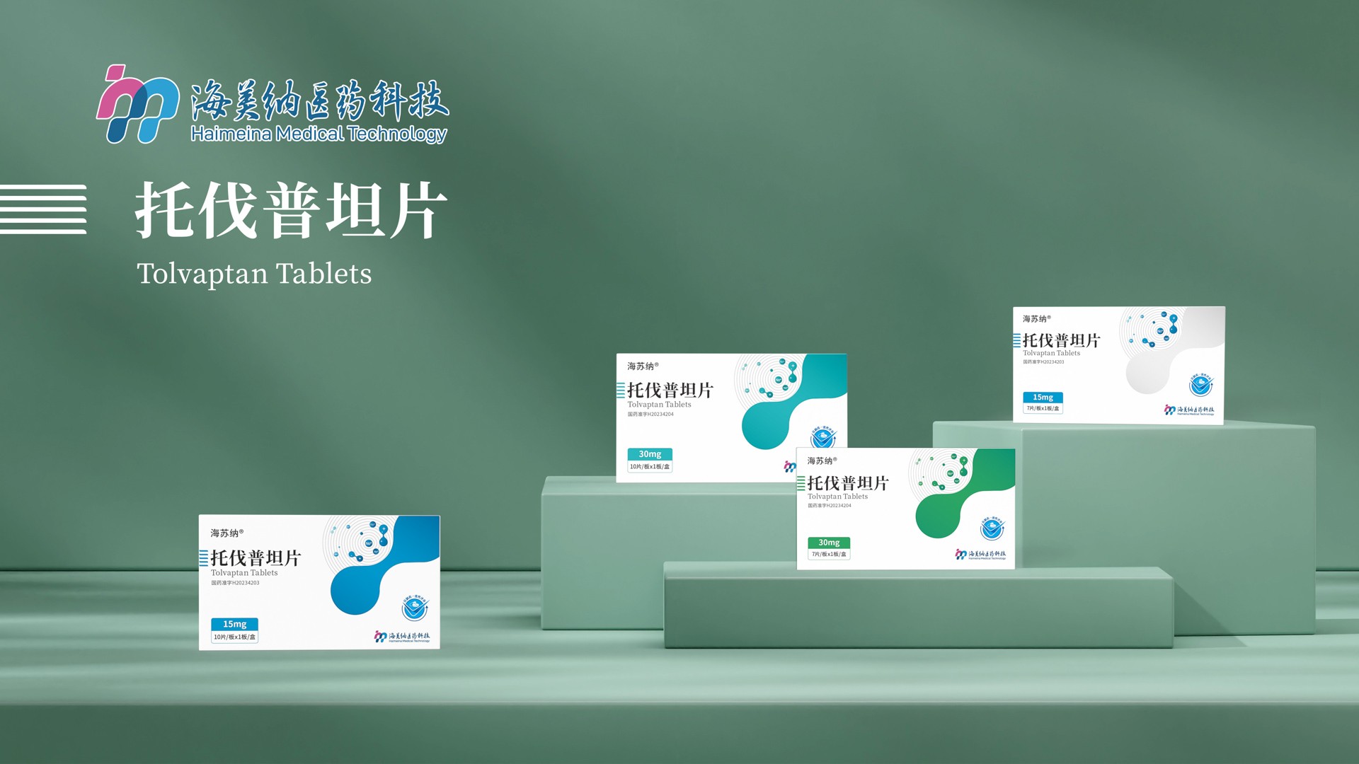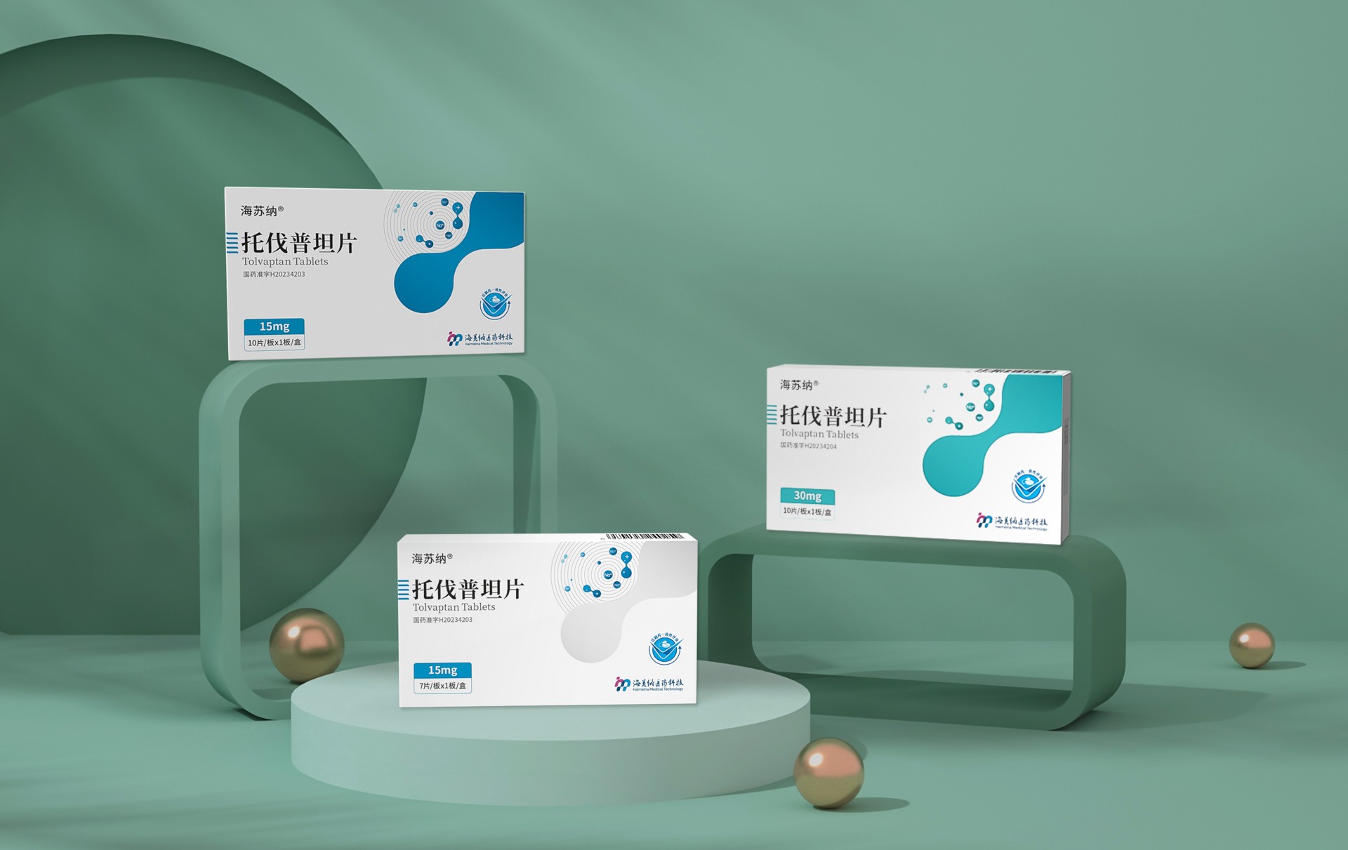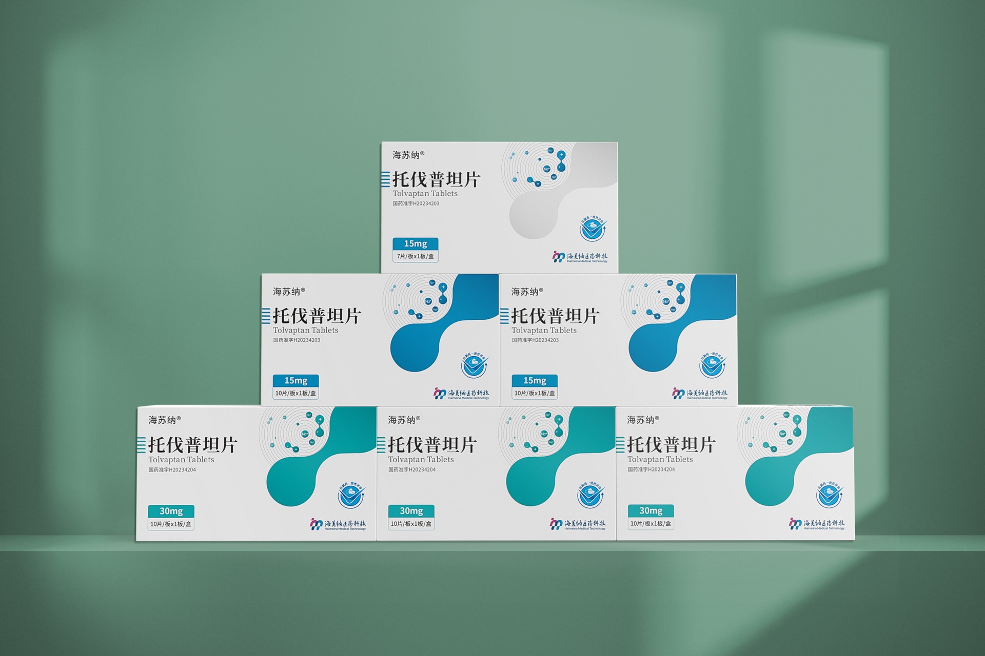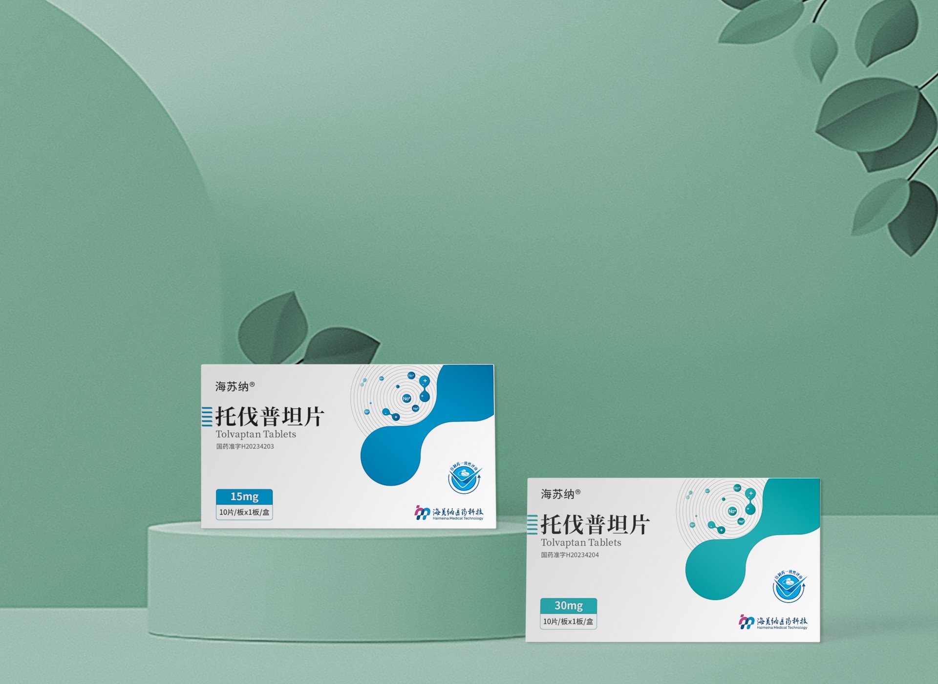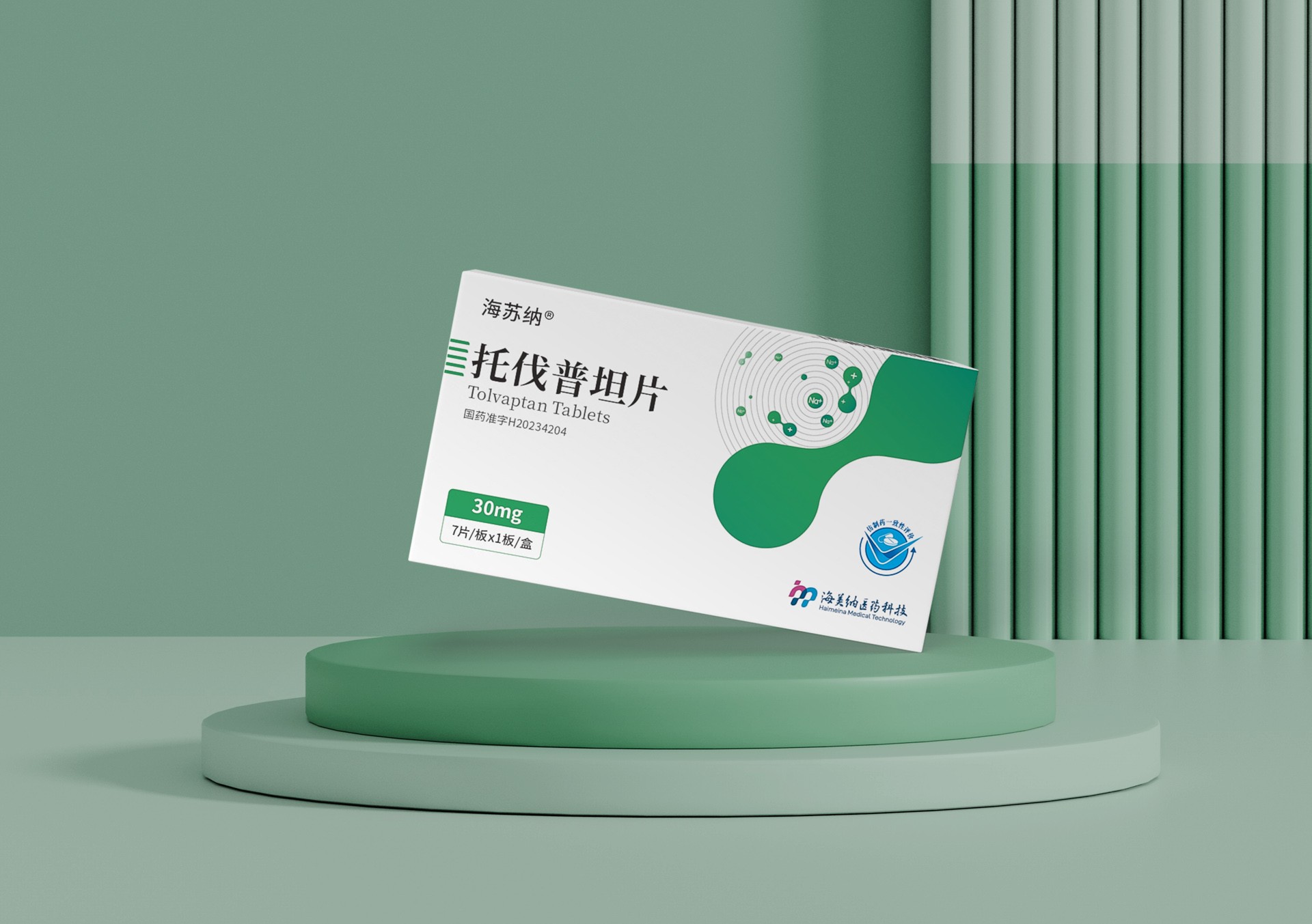 整個(gè)包裝盒以白色為主色調(diào),展現(xiàn)出清新、純凈的視覺(jué)效果,符合醫(yī)療產(chǎn)品的專業(yè)形象。在盒子的設(shè)計(jì)上,巧妙地融入了綠色和藍(lán)色的設(shè)計(jì)元素,不僅為整體設(shè)計(jì)增添了活力,也與托伐普坦片的醫(yī)療屬性相呼應(yīng)。 包裝盒的正面顯著位置印有“托伐普坦片”的中文和英文標(biāo)識(shí),字體清晰易讀,便于患者和醫(yī)護(hù)人員快速識(shí)別。同時(shí),藥品的劑量“30mg”以及包裝規(guī)格“7片/板×1板/盒”等信息也得以明確標(biāo)注,確保患者能夠準(zhǔn)確了解和使用藥品。 包裝盒下方設(shè)計(jì)了一個(gè)淺綠色的圓形臺(tái)座,不僅為藥品提供了穩(wěn)定的支撐,還增加了整體設(shè)計(jì)的層次感。背景墻采用淡綠色,并輔以垂直條紋裝飾,為整個(gè)包裝增添了現(xiàn)代感和時(shí)尚感。在包裝盒的背面或側(cè)面,應(yīng)標(biāo)注國(guó)藥準(zhǔn)字、生產(chǎn)廠家、生產(chǎn)日期、有效期等詳細(xì)信息,確保患者能夠全面了解藥品的相關(guān)信息。 總的來(lái)說(shuō),托伐普坦片的藥品包裝設(shè)計(jì)既體現(xiàn)了醫(yī)療產(chǎn)品的專業(yè)性,又充分考慮了患者的使用體驗(yàn)。通過(guò)簡(jiǎn)約而不失設(shè)計(jì)感的外觀,以及清晰明了的文字信息,該藥品包裝能夠有效地幫助患者識(shí)別和使用藥品,提升了產(chǎn)品的整體品質(zhì)和市場(chǎng)競(jìng)爭(zhēng)力。