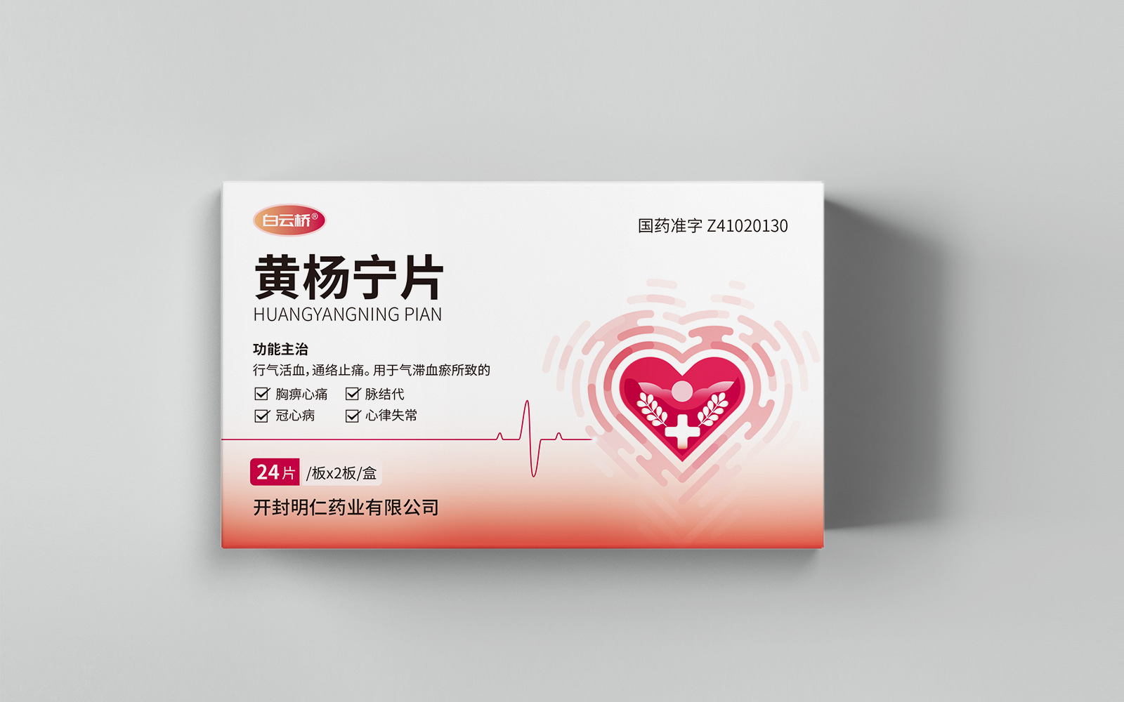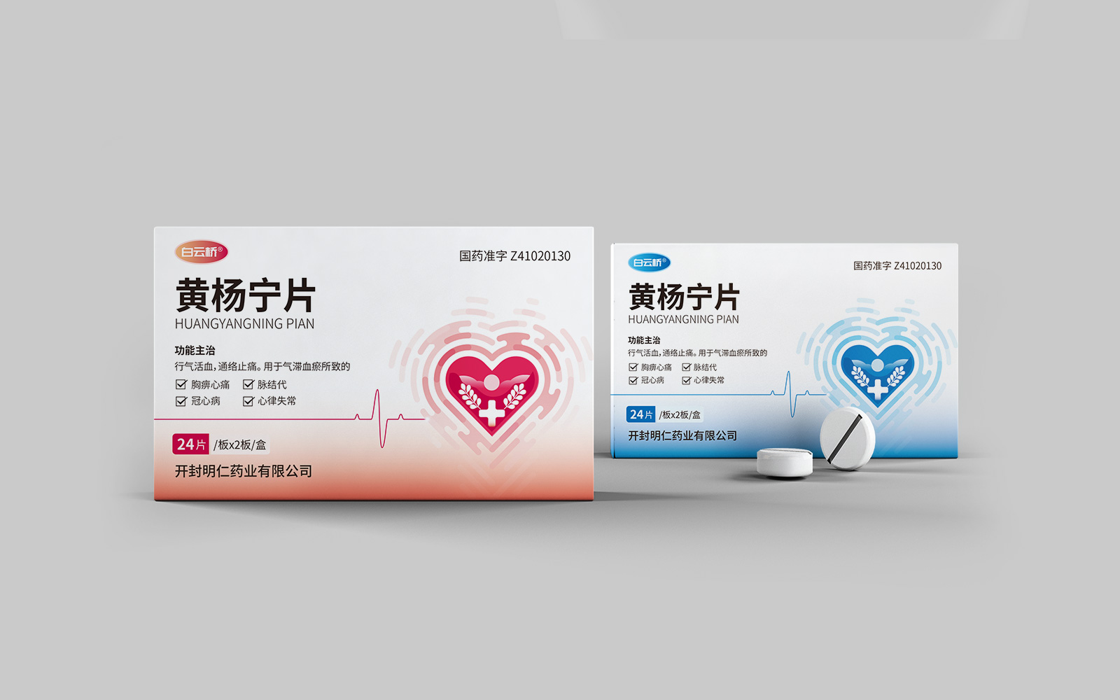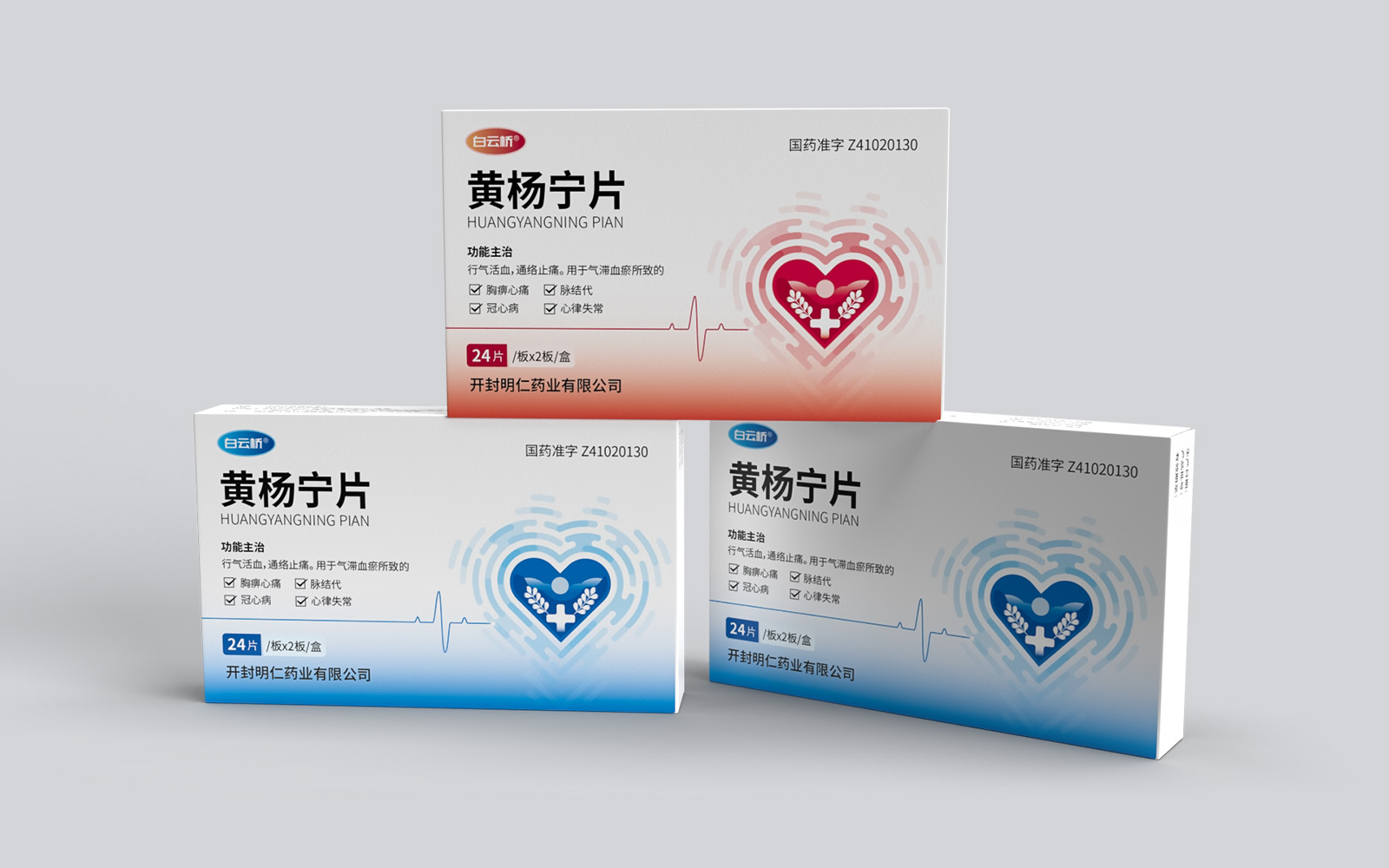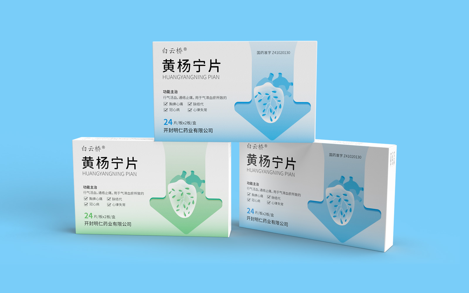 整體畫面以藍色為主,具有涼爽、安靜舒適感覺。藍色有利于病人克制沖動和煩躁,能夠平緩安撫病人的心情。箭頭,體現(xiàn)藥品快速、持久、作用精準,迅速緩解心絞痛等癥狀同時形成獨特圖形符號,符號簡潔,識別度高。心臟圖案,與藥品作用屬性符合加強對藥品的認知與記憶。黃楊葉片與心臟血管相結合,體現(xiàn)純中藥植物提取作用于心腦血管療效。同時結合脈絡線條設計凸顯藥品活血通絡的藥理,便于消費者認知。