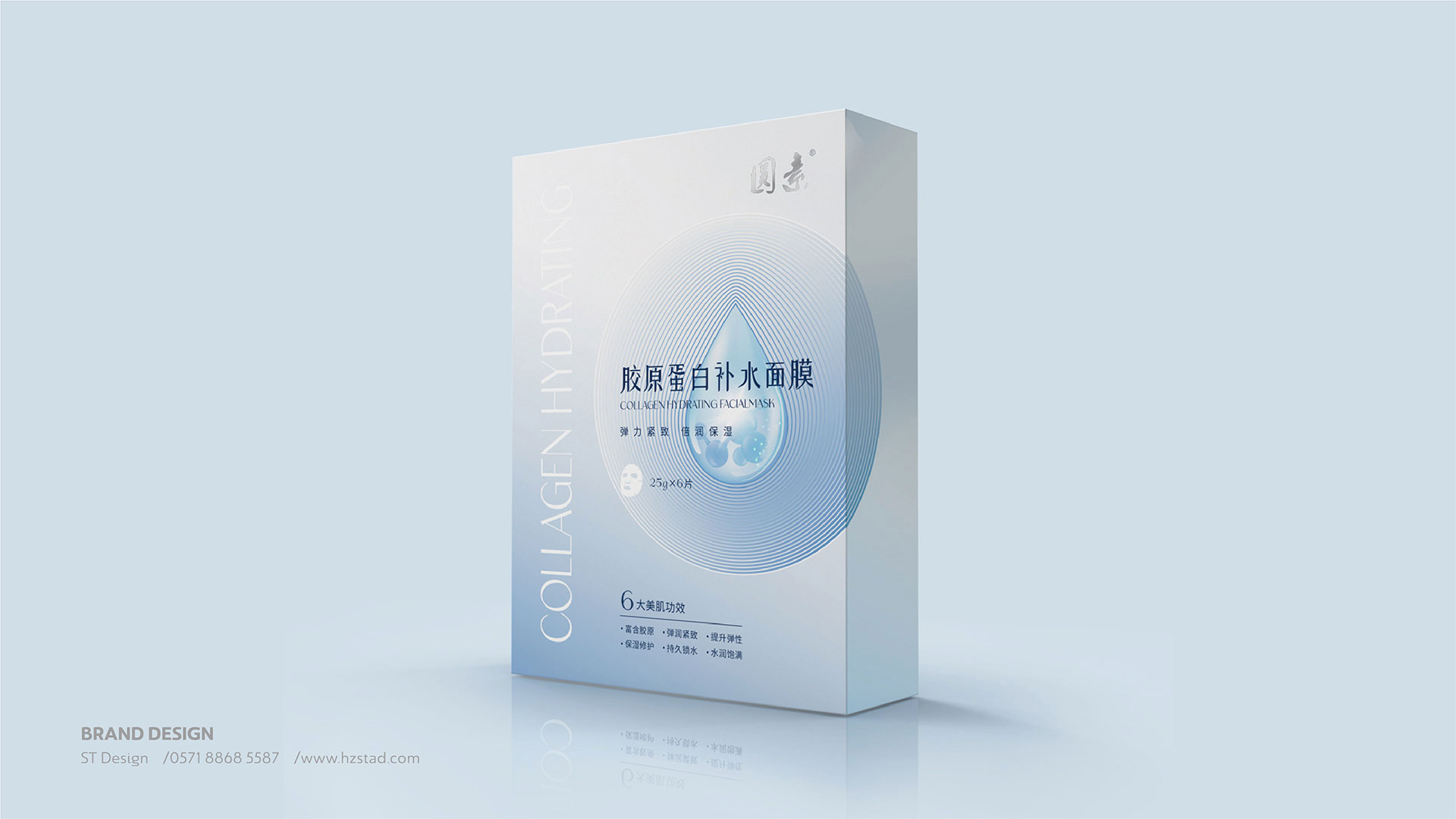 經過前期的調研及分析,石特了解到該款產品甄選優質膠原蛋白精華,具有補水鎖水等功效,基于此,石特提出兩個包裝設計的方向:方案一:在突出產品通用名的同時,將透亮的水滴作為主畫面,并巧妙融入膠原蛋白的分子,進而凸顯面膜補水鎖水的特性;同時選用淡藍、白為主色調,整體設計簡約,給人清爽,潔凈的感覺。方案二: 考慮到企業位于蒙古這一特性,在設計時,主畫面以蒙古族紋樣為基礎,將八種植物進行融合,凸顯提取物的自然純粹;采用上下的排版方式,重點明顯,突出功效,總體設計簡潔大方,高級感強。通過對包裝升級統一形象后,深化“膠原蛋白補水面膜”在用戶心中的外在形象,品類包裝問題得以解決。
