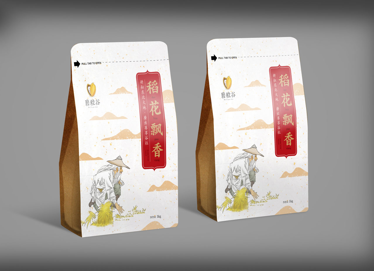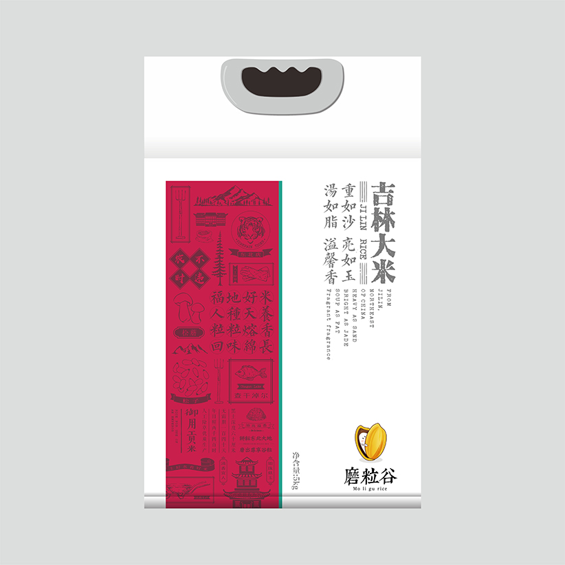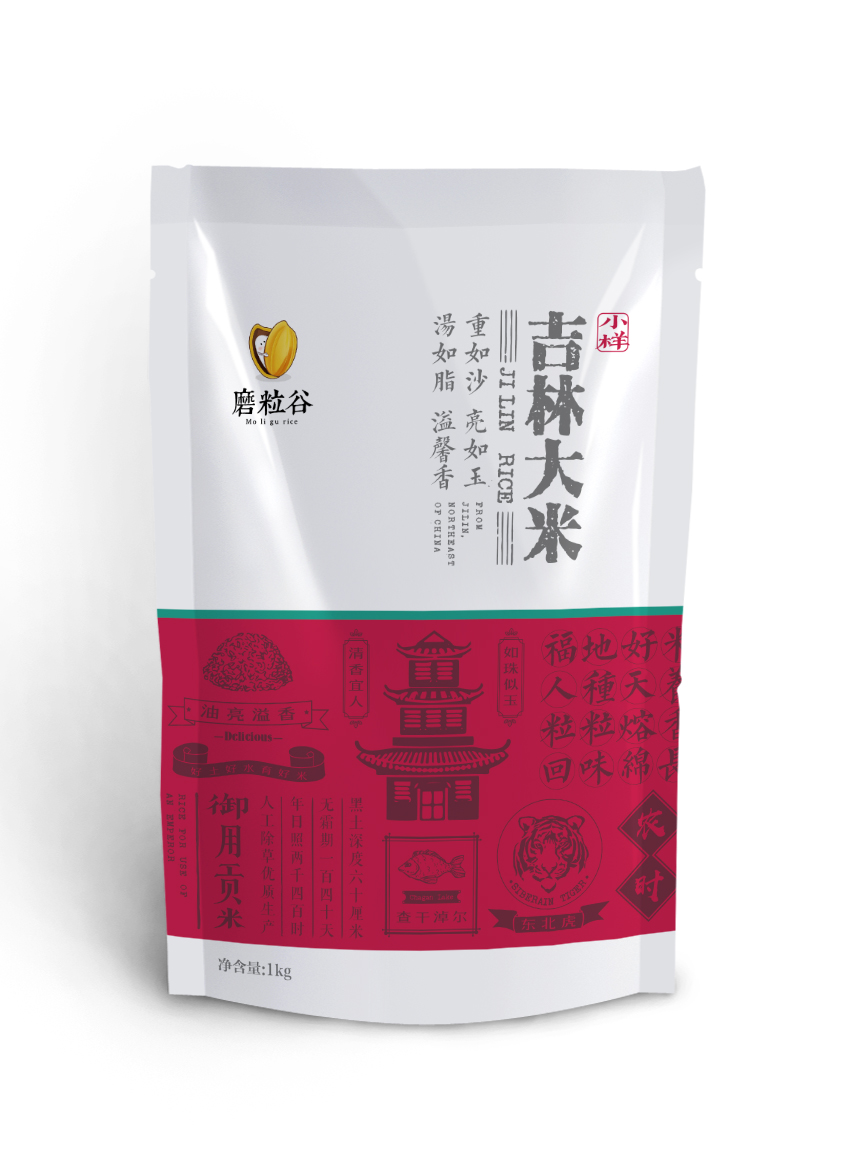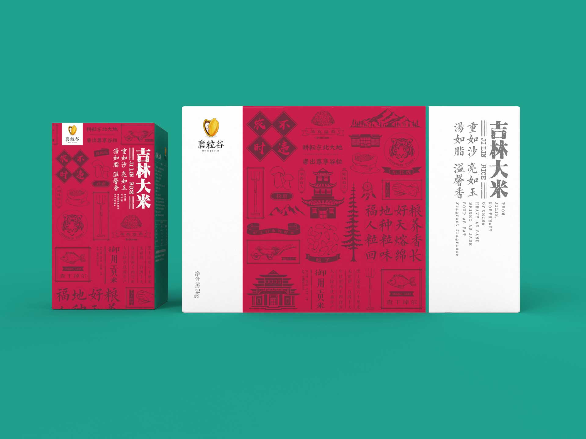 做最好產(chǎn)地的米,分享自然的味道,是磨粒谷米業(yè)的品牌理念。我們將這一理念融合進(jìn)包裝里,整個(gè)系列的產(chǎn)品包裝畫(huà)面都運(yùn)用自然的元素去拼接,把屬于大米的那份天然的濃香傳達(dá)給客戶。部分產(chǎn)品包裝上運(yùn)用了地域元素拼貼+撞色,將東北虎、查干湖和松磨這些具有代表性的元素進(jìn)行拼貼,再加上深沉的紅色做烘托給人強(qiáng)烈的年代感和悠久感。