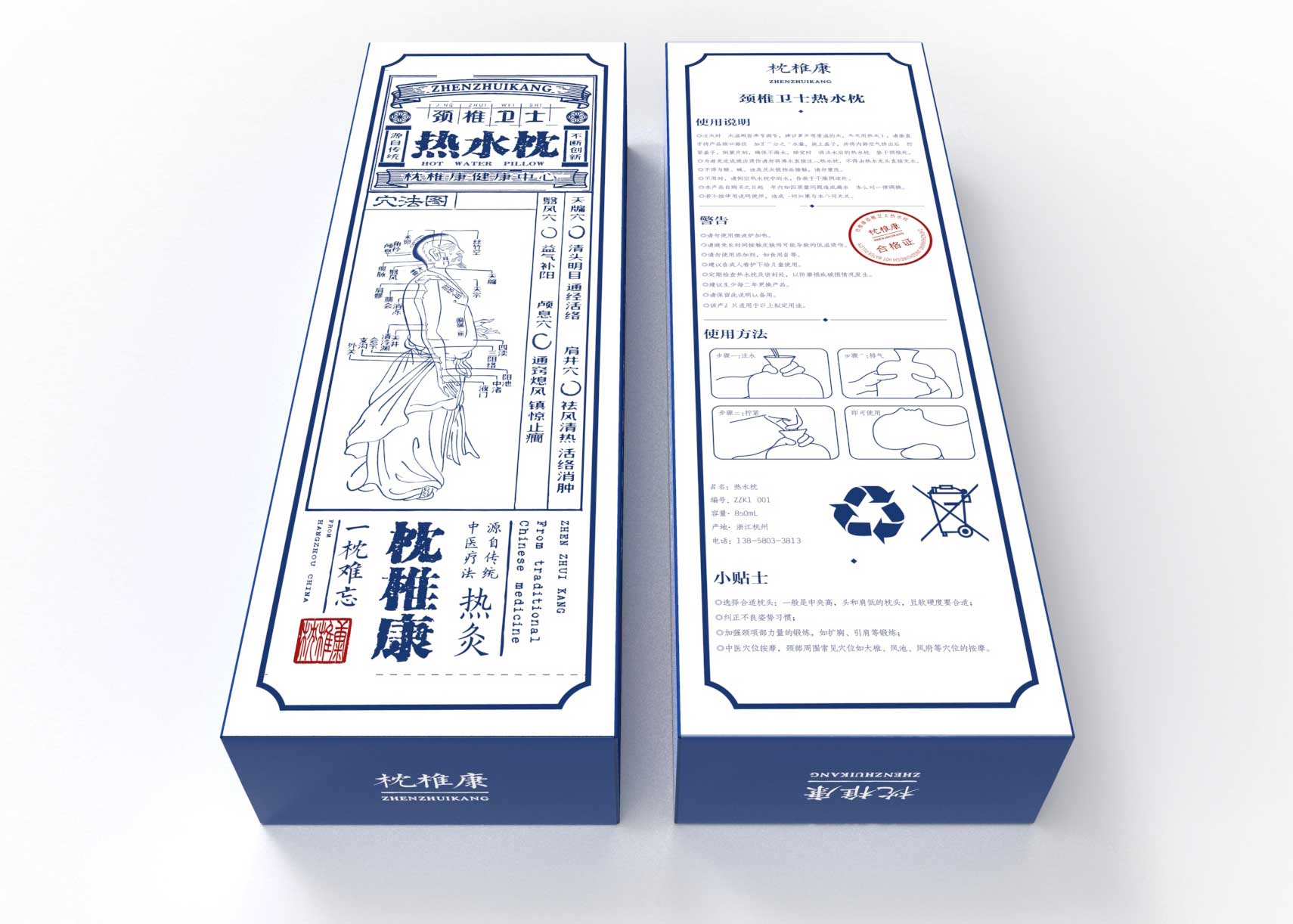 包裝上繪有人體穴法圖,將傳統的中醫療法淋漓盡致的表達出來,同時繪有使用方法示意圖,這樣購買者使用比較方便。除了使用說明及警告這些常規文字產品包裝上還放有頸椎小貼士讓購買者感覺既貼心又實用。產品包裝主題顏色是藍色,向購買者傳達一種健康的理念。