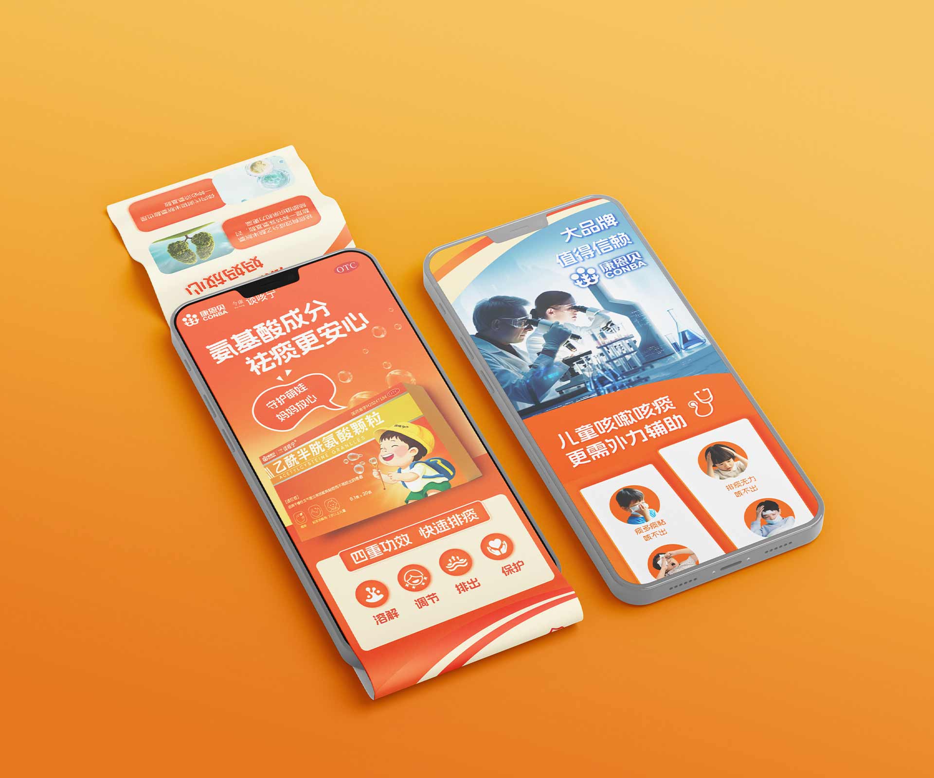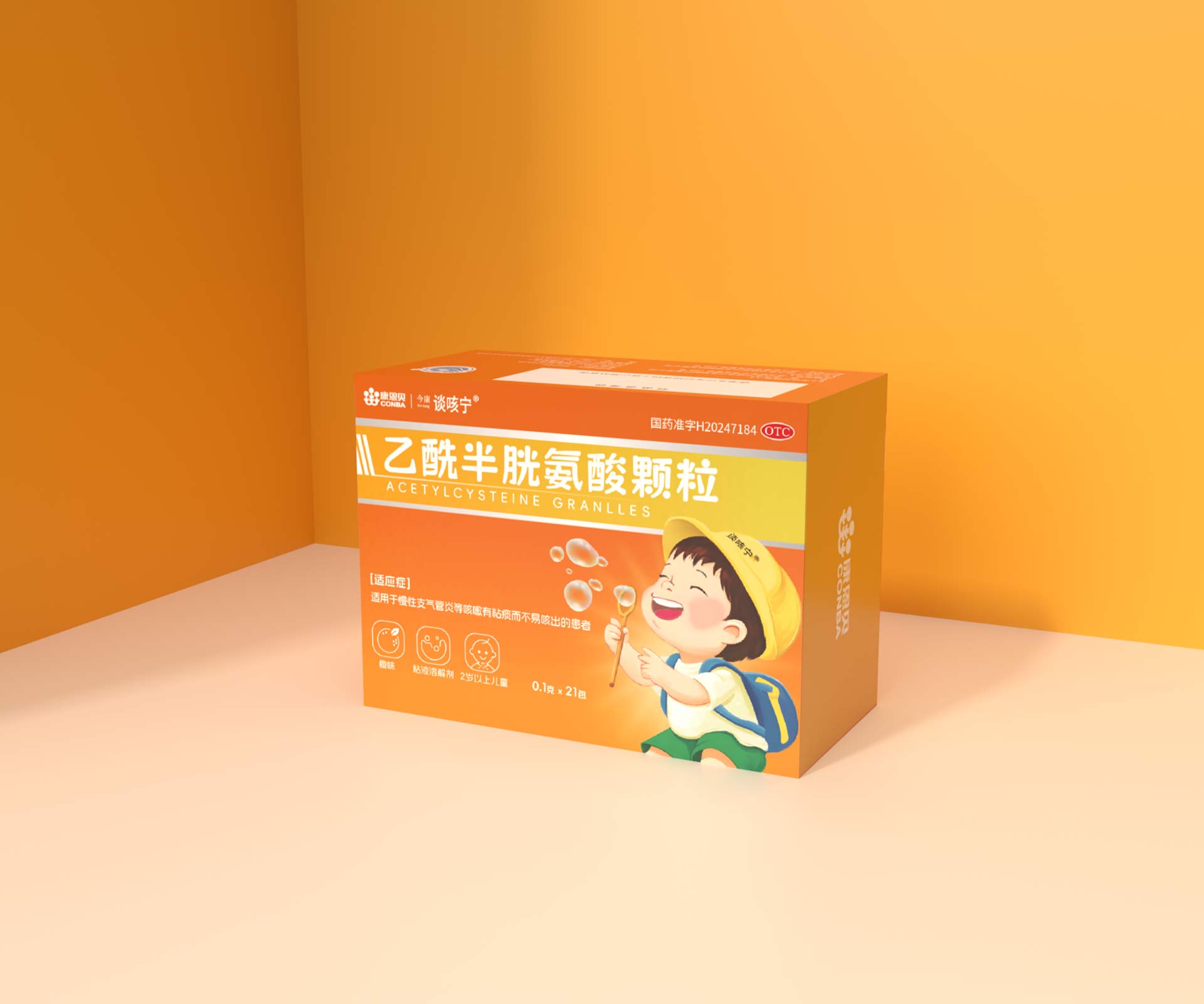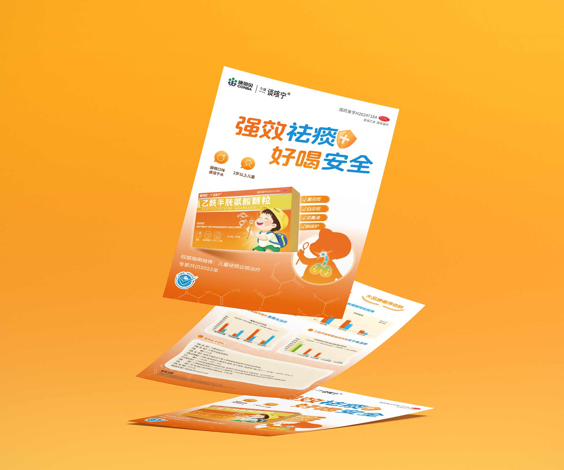 浙江金康醫藥旗下乙酰半胱氨酸顆粒,聚焦2 歲以上兒童祛痰止咳需求,面臨三大設計挑戰:需傳遞 “權威指南推薦(兒童祛痰止咳治療 )、臨床數據支撐(減少急性支氣管炎風險 )” 的醫療價值,強化家長信任:突破傳統藥品的冰冷感,通過視覺設計營造 “好喝、安全、親和” 的氛圍,降低兒童用藥抵觸;信息高效傳遞在包裝、詳情頁、單頁中,分層傳遞 “核心功效(強效祛痰 )、安全優勢(口服安全 )、使用場景(兒童支氣管炎等 )”,適配藥店終端、線上推廣等多元渠道。